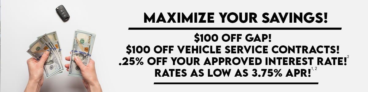 ¹APR=Annual Percentage Rate. Not all applicants will qualify for the lowest rate. FICO 9 credit score must be 700 or higher to qualify for lowest APR. Program, rates, terms, and conditions are subject to change without notice. Rates may vary depending on each consumer’s creditworthiness. Auto Loan Promotion is valid April 1st – April 30th, and applies to cars, pickup trucks, and SUVs only. Monthly payment example is $22.59 per each $1000 borrowed for up to 48 months at 4.00% APR. ²Autopay must be enabled at the time of funding to receive the .25% off the interest rate. Minimum loan amount $10,000. ³Loans $20,000 and under will receive $100 at the time of loan funding and loans $20,000.01 or more will receive $200 at the time of funding.
